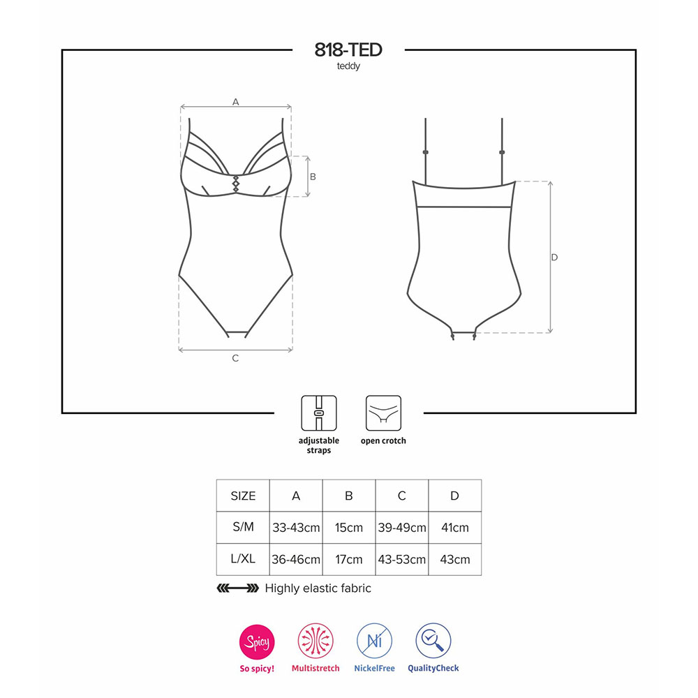 Obsessive 818 body on valmistatud poolläbipaistvast kangas, mis on kaunistatud lillelise mustriga. Tootel on avatud jalgevahe, mille abil saate muuta omavahelised õhtud veelgi romantilisemaks. Body’l on ees seksikas kaunistus ning topeltpaelad rõhutavad teie rinnakorvi.