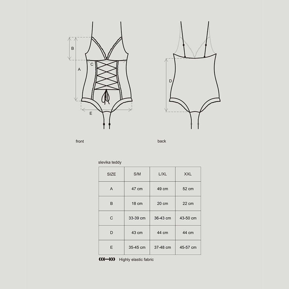 Body on valmistatud pehmest, elastsest pitsist, mis rõhutab kehakumerusi ning loob võrgutava silueti. Detailid nagu sügavad väljalõiked, õhuline mustrimäng ning avatud jalgevahe lisavad riietusele intensiivset erootilisust. Reguleeritavad paelad ja hästi istuv lõige tagavad kandmismugavuse ning sobivuse erinevatele kehatüüpidele.