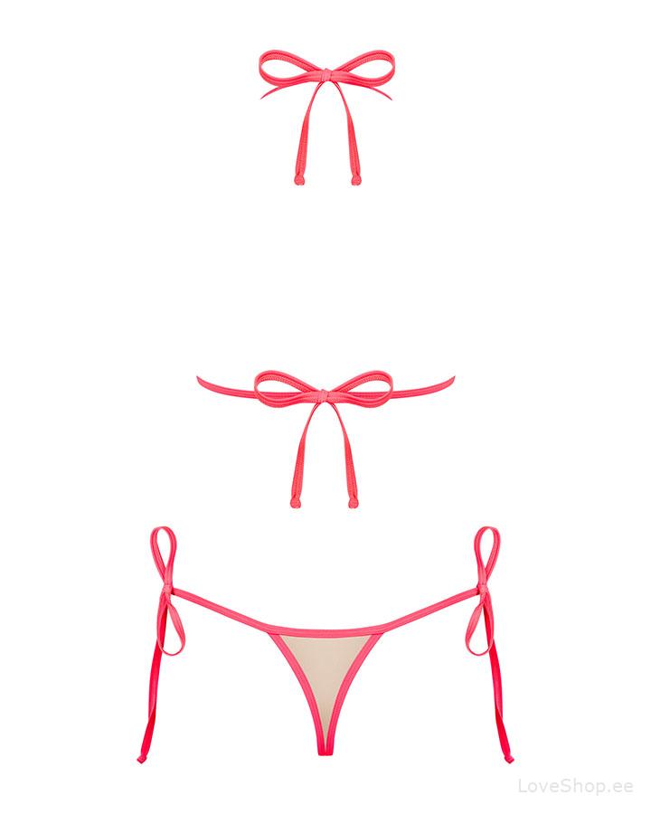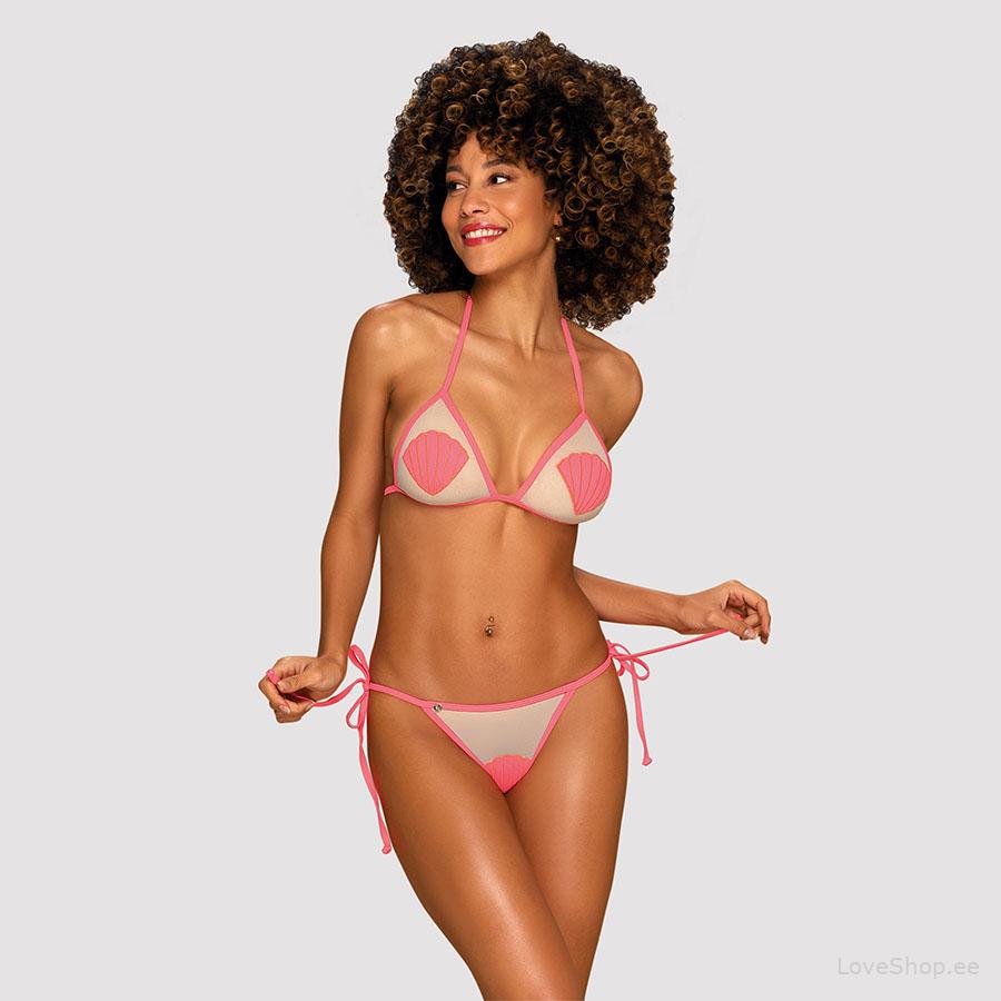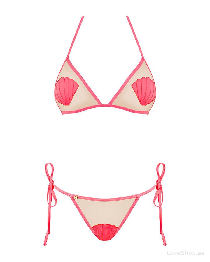 Obsessive Playa del Amor bikiinid on kelmikat beeži tooni, mida ilmestavad erkroosad detailid. Rinnahoidja on kaunistatud kelmikate teokarpidega.