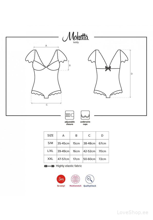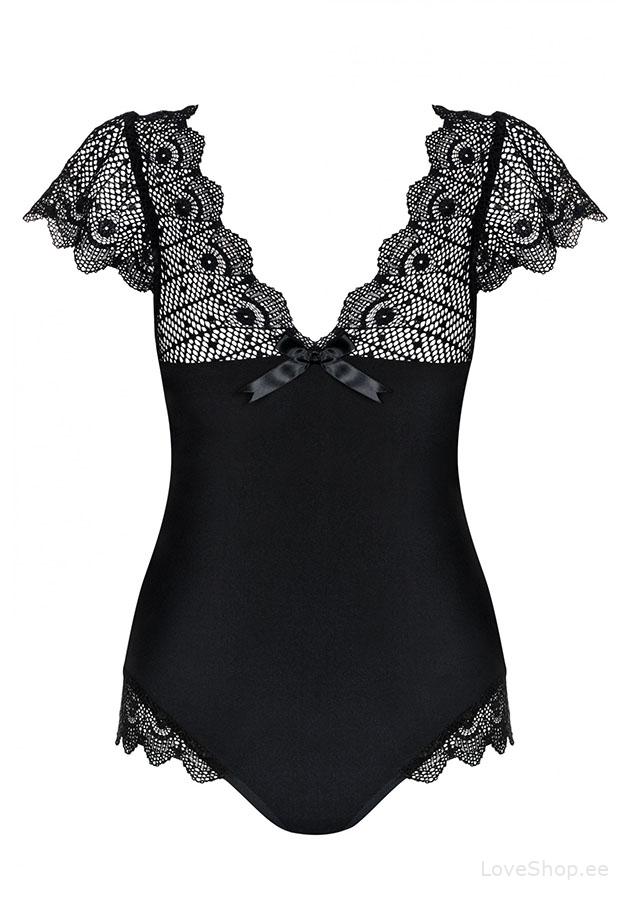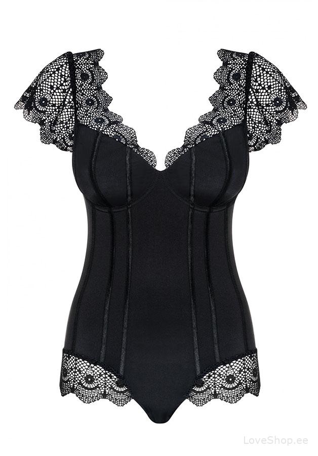 Tooge oma loomulikku võlu esile musta Obsessive Moketta body äärmiselt naiseliku lõikega. See kaunistab kaunilt teie keha, paljastab kenasti jalad ja rõhutab rindu, muutes selle super seksikaks. Vertikaalsed paelad salendavad optiliselt taljet ning õlgadel olev õhuline pitsiviimistlus lisab kergust ja elegantsust.