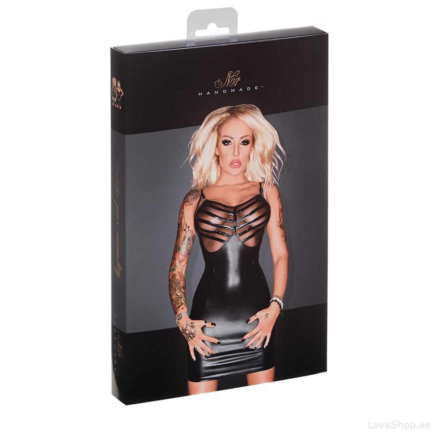 Noir Handmade F078 kleit on valmistatud läikivast eco-nahast, mis tekitab sensuaalse wet-look ilme. Kleidi rinnakorv on valmistatud poolläbipaistvast tüllist ning kaunistuseks on lisatud läikivad PVC-ribad.