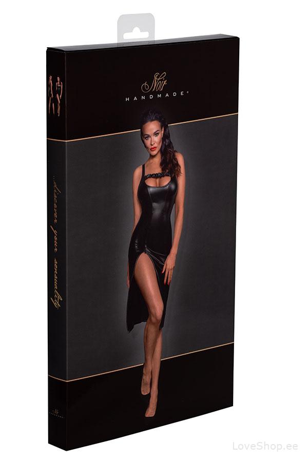 Noir Handmade F251 kleit on valmistatud eco-nahast, mis tekitab sensuaalse wet-look ilme. Kleidil on ees rinnakorvi juures satsiline pael, mis lisab omakorda veelgi rohkem seksapiilsust.