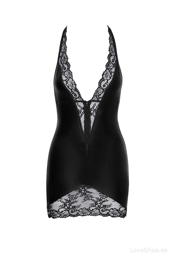 Noir Handmade F283 kleit on valmistatud eco-nahast, mis loob imelise wet-look ilme. Kleidile lisavad seksikust selle imelised lillemotiiviga pitskaunistused.