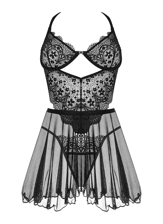 Särgi ülemist osa kaunistab kaunite mustritega pits, mis tõstab esile dekoltee ja lisab luksusliku aktsendi. Alumise osa kerge ja poolläbipaistev materjal toob esile keha loomuliku ilu, luues õhulise ja sensuaalse ilme. Komplekti kuuluvad ka elegantsed stringid, mis täiendavad öösärki ideaalselt, pakkudes terviklikku ja harmoonilist välimust.