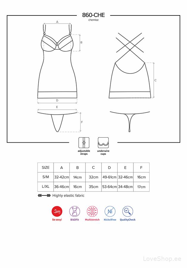 Obsessive 860 öösärk on uskumatult naiseliku disainiga, mida ilmestab roosimustriga poolläbipaistev pits. Ideaalse sobivuse tagamiseks on selja osa peal olevad paelad reguleeritavad