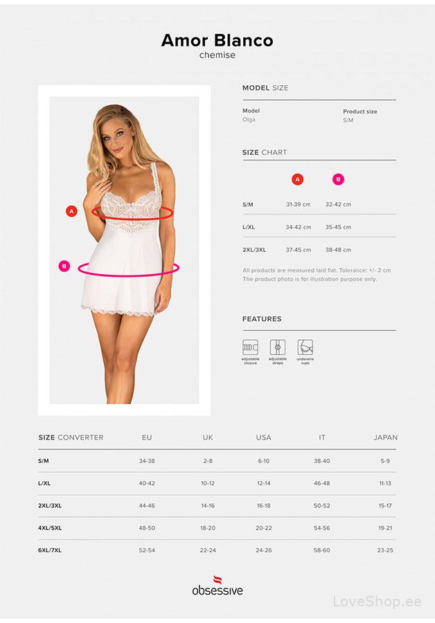 Naiselikkuse jõud ja seksikirevus on midagi, mis eristab äärmiselt seksikat Obsessive Amor Blanco öösärki. Toode sobib ideaalselt pulmaõhtuks, kuid see on ka suurepärane valik pikaks ja kirglikuks õhtuks oma kallimaga.