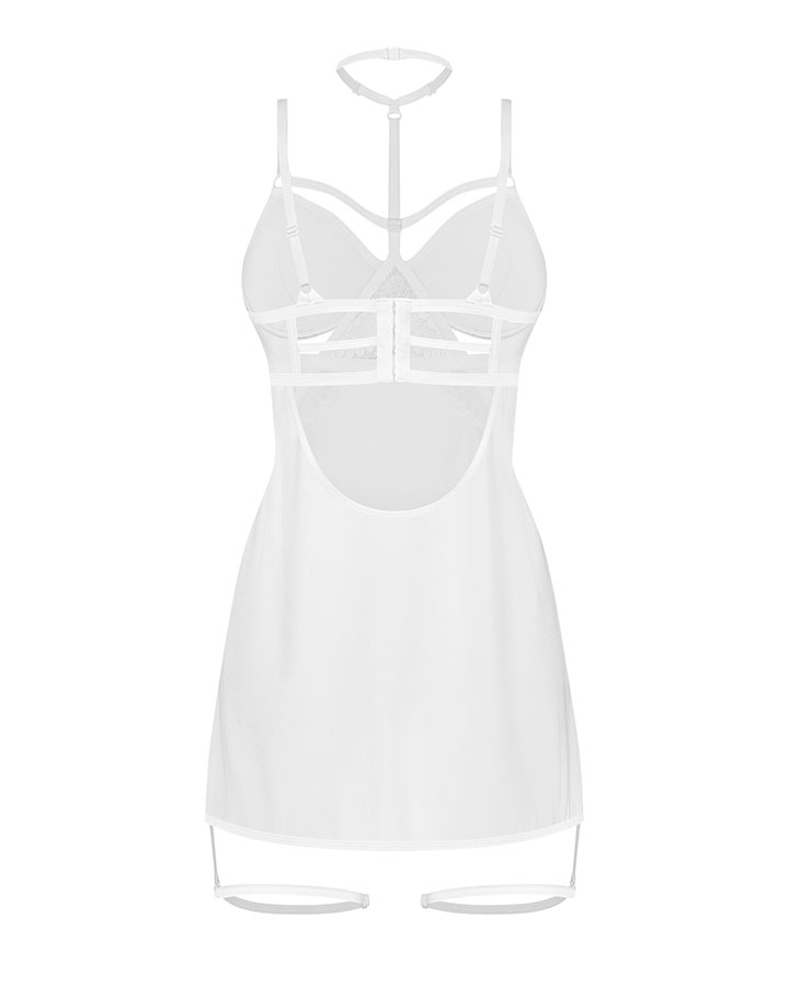 Tagaküljel asuv mitmeastmeline kinnitus võimaldab mugavat ja täpselt istuvat kandmist. Samas lisavad seljal paiknevad vertikaalsed luud vormikust ja peent elegantsi. Reguleeritavad reierihmad, mis meenutavad sukahoidjaid, toovad mängulise ja seksika aktsendi, täiendades öösärgi ainulaadset ilmet.