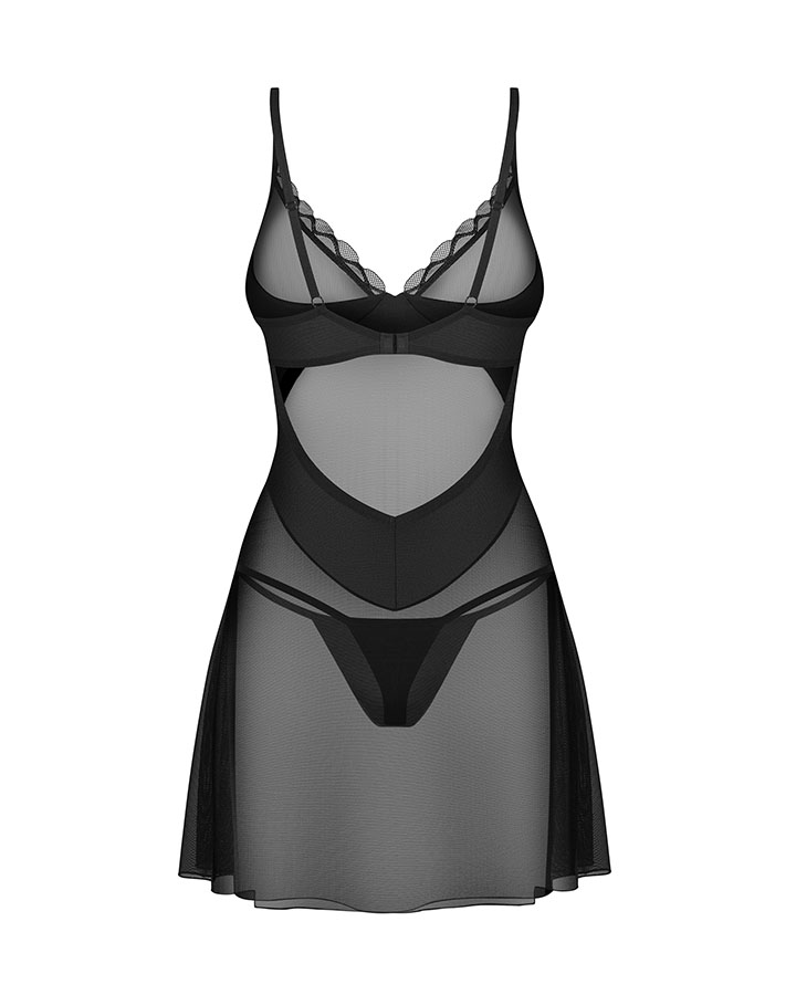 Öösärk Obsessive Stelisa on sensuaalne ja elegantne pesukomplekt, mis toob esile naiselikkuse kõige kaunimal viisil. Must läbipaistev kangas järgib õrnalt keha joont, luues võrgutava ja kergelt salapärase ilme. Komplekti kuuluvad reieni ulatuv öösärk ning klassikalised stringid, mis täiendavad täiuslikult üksteist.