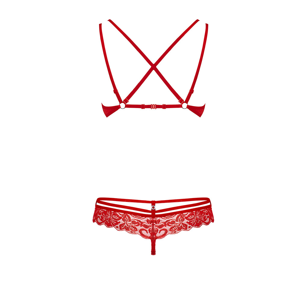 2-osaline pesukomplekt Obsessive 860 on valmistatud sensuaalsest punasest pitskangast, mis on kaunistatud vastupandamatu roosimutriga. Rinnahoidjale ja püksikutele on lisatud dekoratiivsed paelad, mis toovad esile teie naiseliku figuuri.