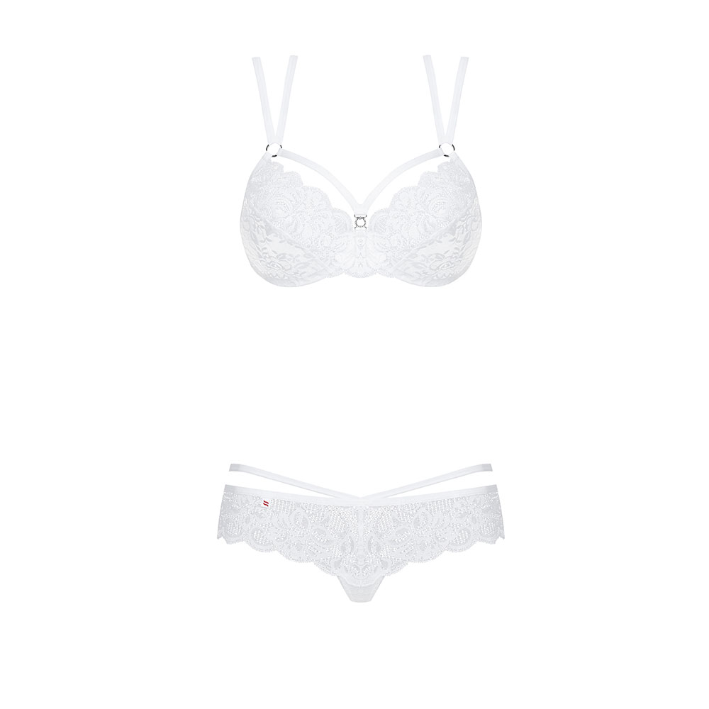 2-osaline pesukomplekt Obsessive 860, kuhu kuuluvad rinnahoidja ja stringid, mis valmistatud sensuaalsest valgest pitskangast.