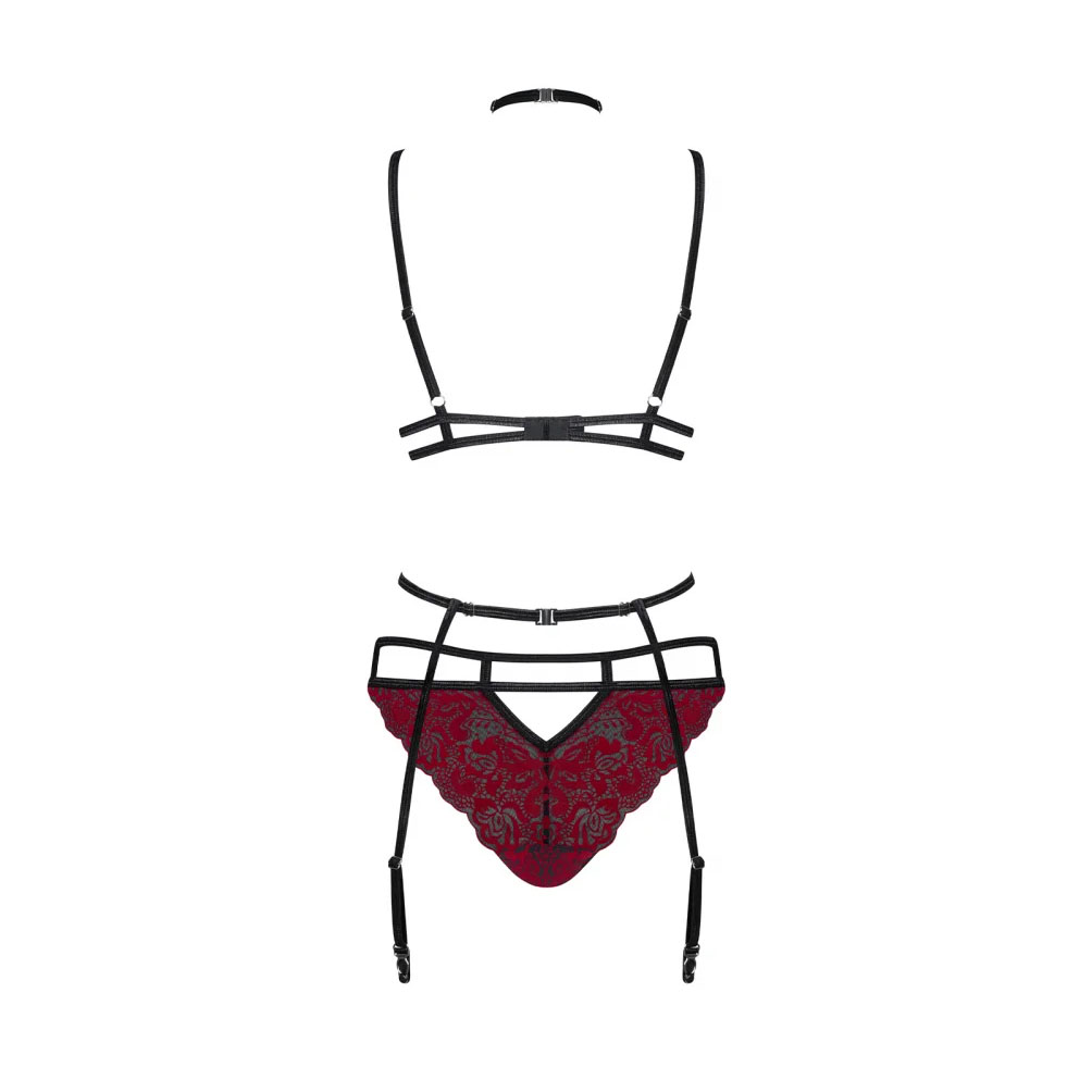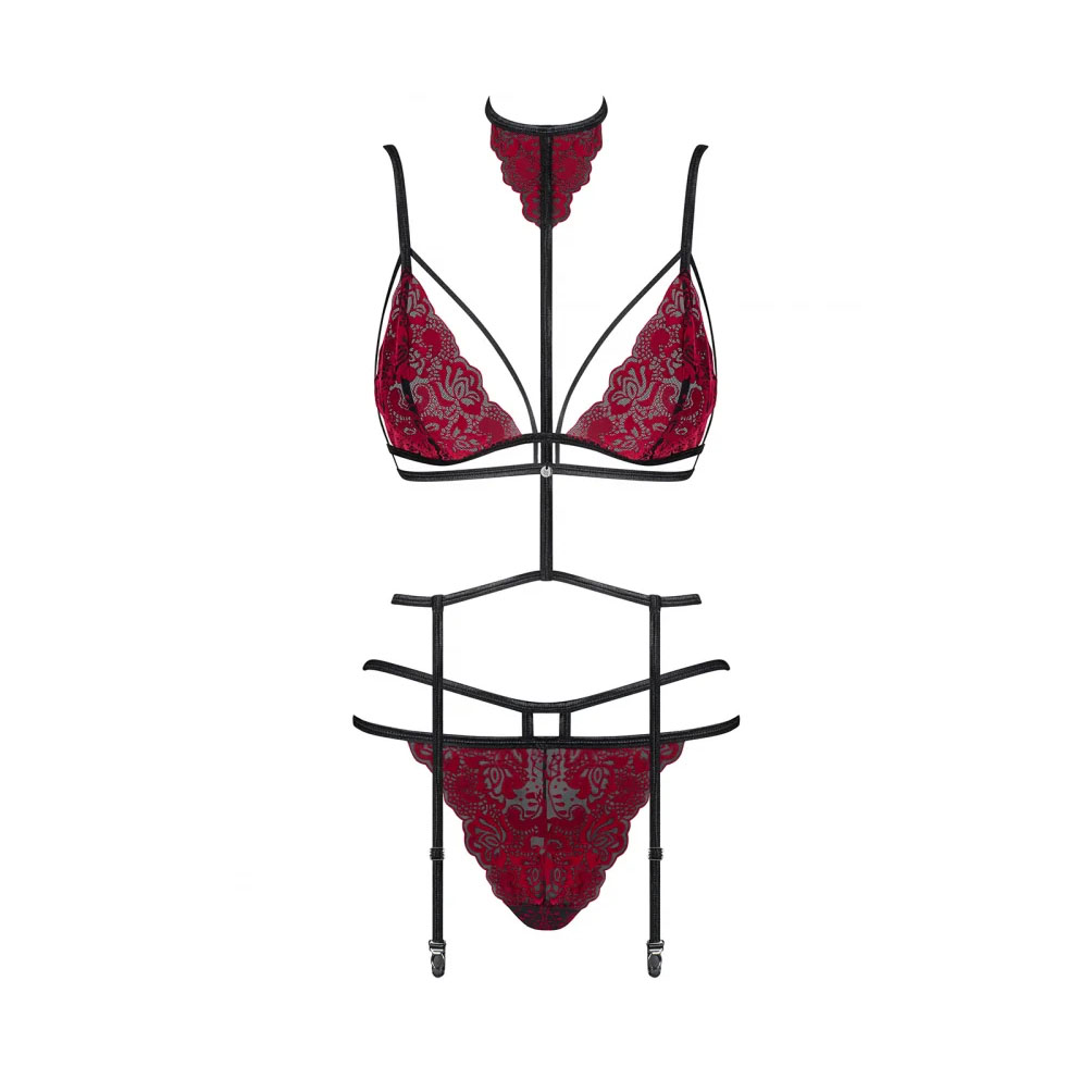 Burgundia punasest pitsist 3-osaline pesukomplekt Sugestina. Komplekti kuulub lillise pitsiga rinnahoidja, sukavöö koos nelja sukapaela – ja kaelapaelaga ning lillelise pitsiga stringid.