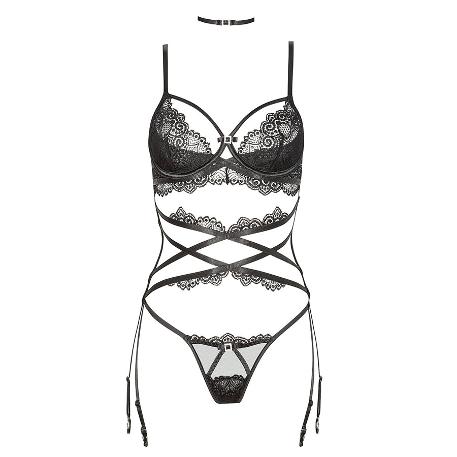 Beauty Night Diamond on 4-osaline pesukomplekt, mis on valmistatud lummavast pitsist ja satiinist. Komplekti kuuluv sukahoidja on omapärase disainiga, mis koosneb ristuvatest paeltest. Rinnahoidja, kaelavõru ja stringid on kaunistatud läikiva kaunistusega.