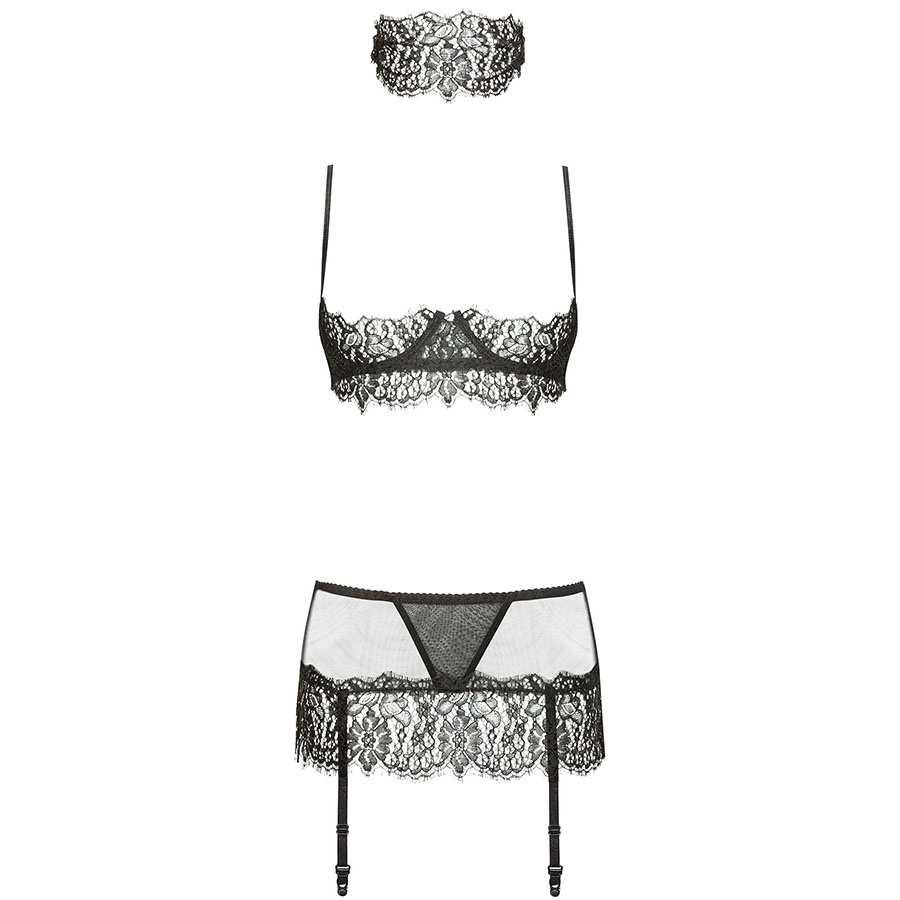 Beauty Night Serenity on erootiline 4-osaline pesukomplekt, millel on avatud rinnahoidja ning väga seksikas tagant seotav sukavöö koos kelmika silmakattega.