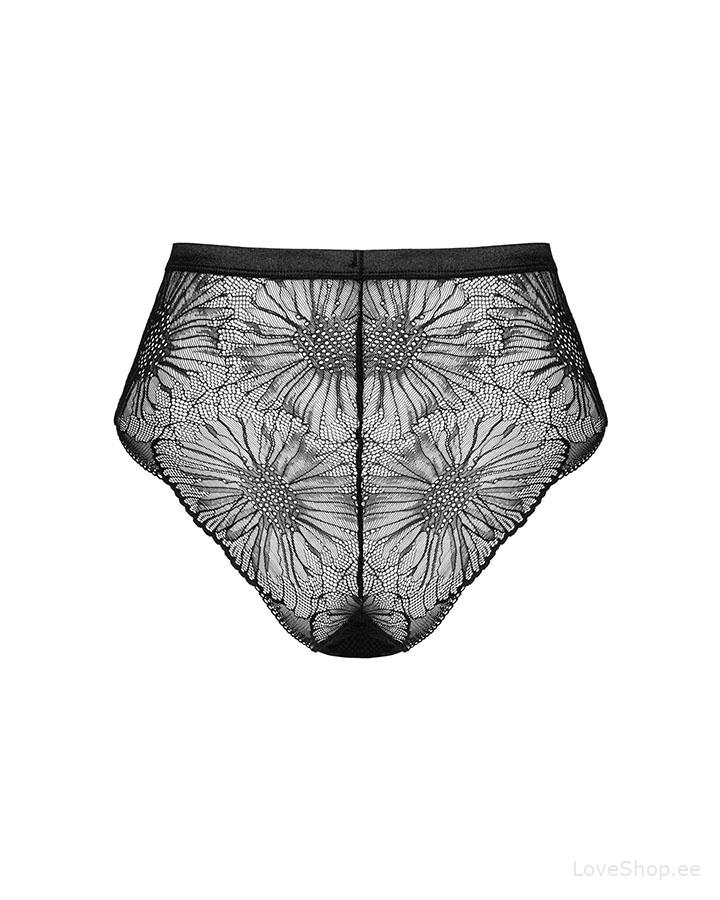Obsessive Mibelia püksikud on valmistatud poolläbipaistvast kangast, mis on kaunistaud lillemotiivilise pitsiga. Püksikutel on ees väljalõiked ning kelmikas ripats.