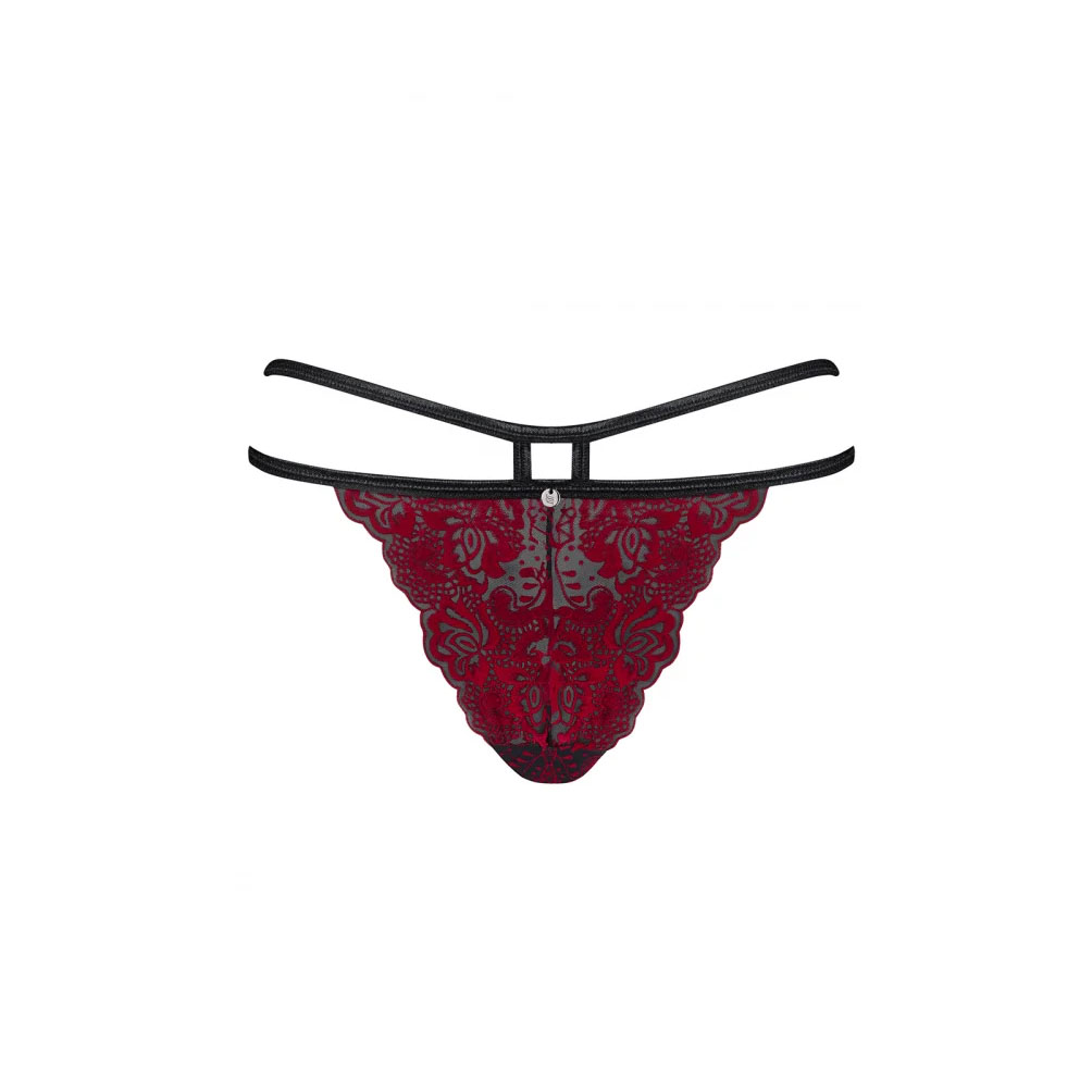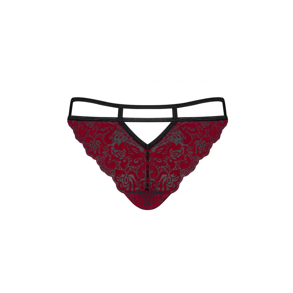 Burgundia punased ja sametisest pitsist püksikud Obsessive Sugestina. Püksikute kahekordne vööpael rõhutab puusi, toob esile naiselikud kurvid ning tagaosa lõige toob esile tuharad.