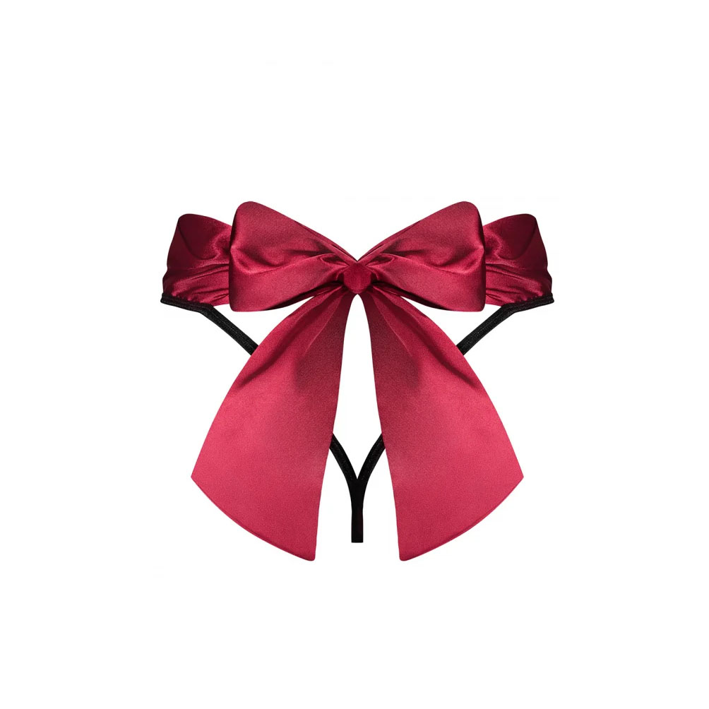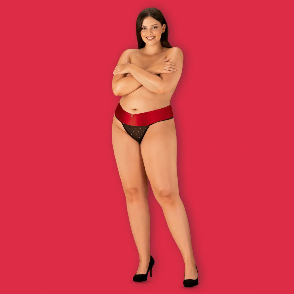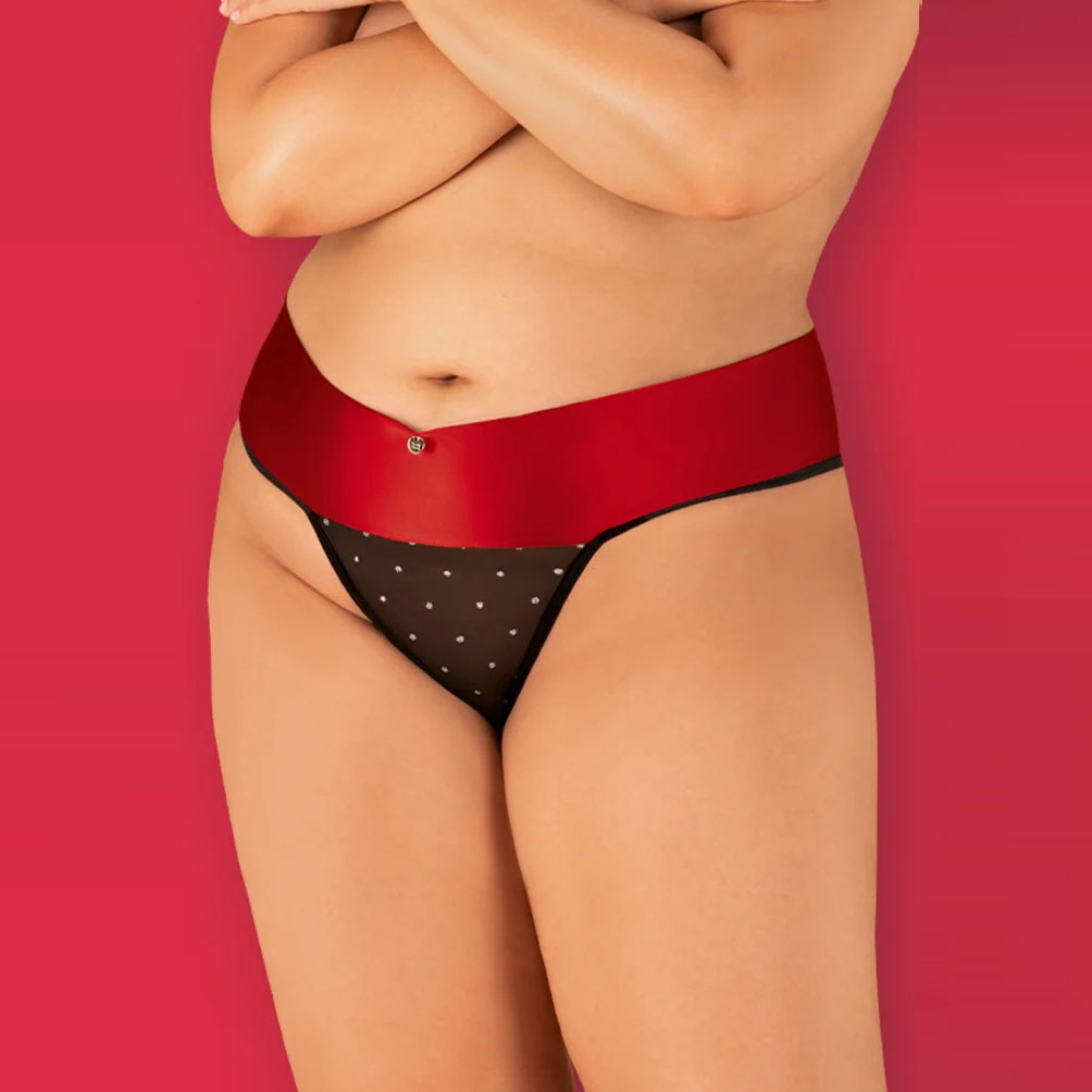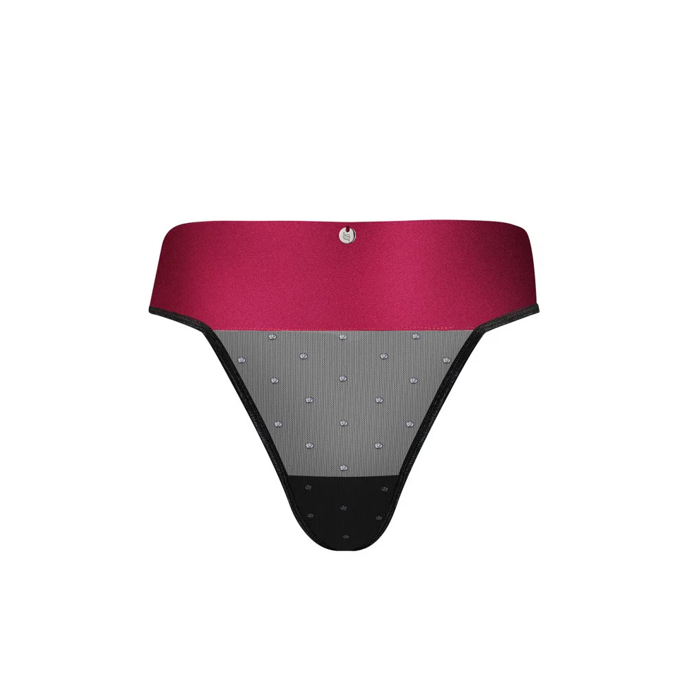 Satiinist kõrge pihaga stringid Obsessive Tienesy, mis on eest kaunistatud hõbedase riPatsiga ja tagant satiinist lehviga. Vürtsi lisab pool-läbipaistev ja ulakate täpikestega alumine osa.