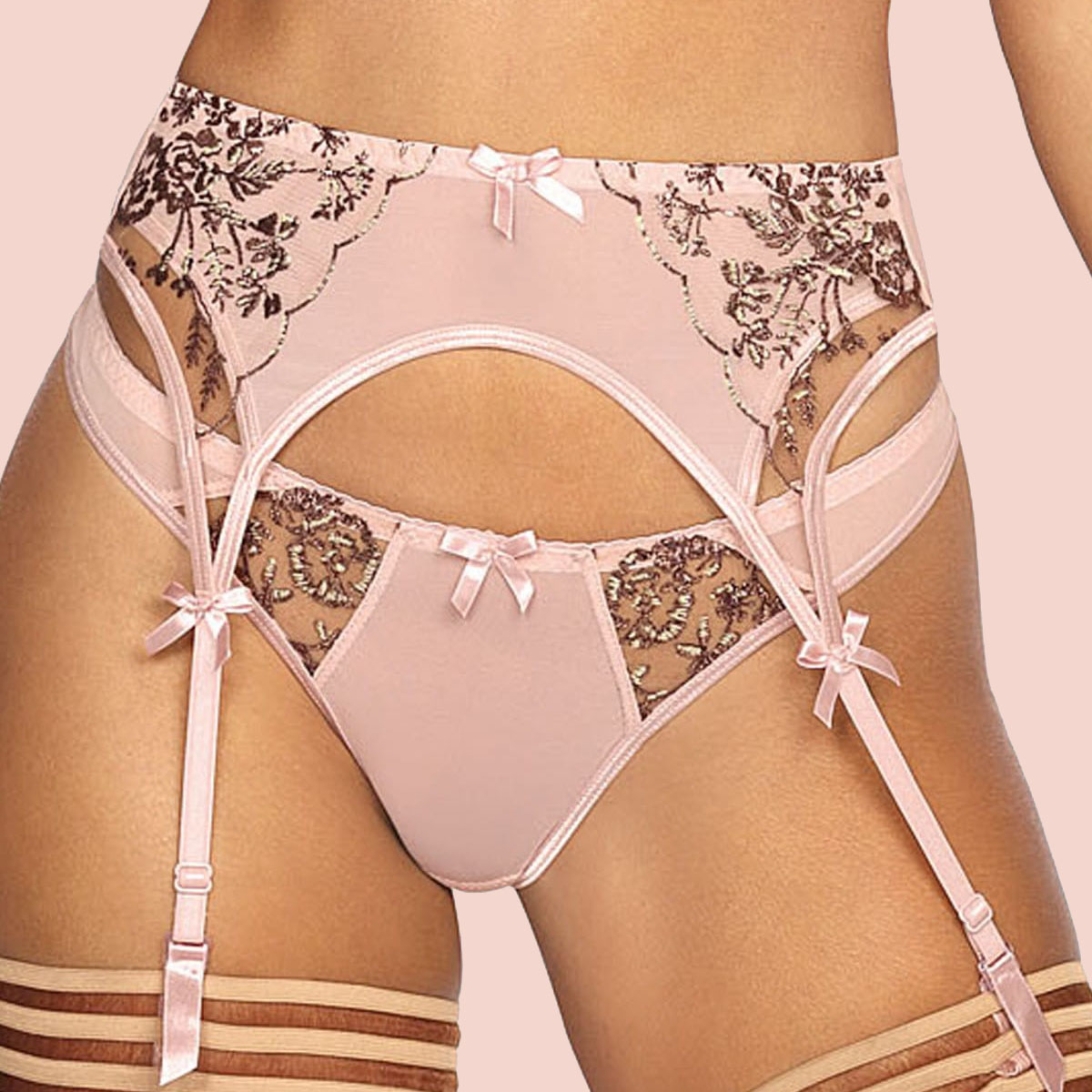 Säravad kuldsed tikandid, satiinist viimistlused ja sukapaelad koos poolläbipaistva puuderroosa kangaga moodustavad elegantse ja sensuaalse Summer Love pesukollektsiooni kuuluva sukahoidja.