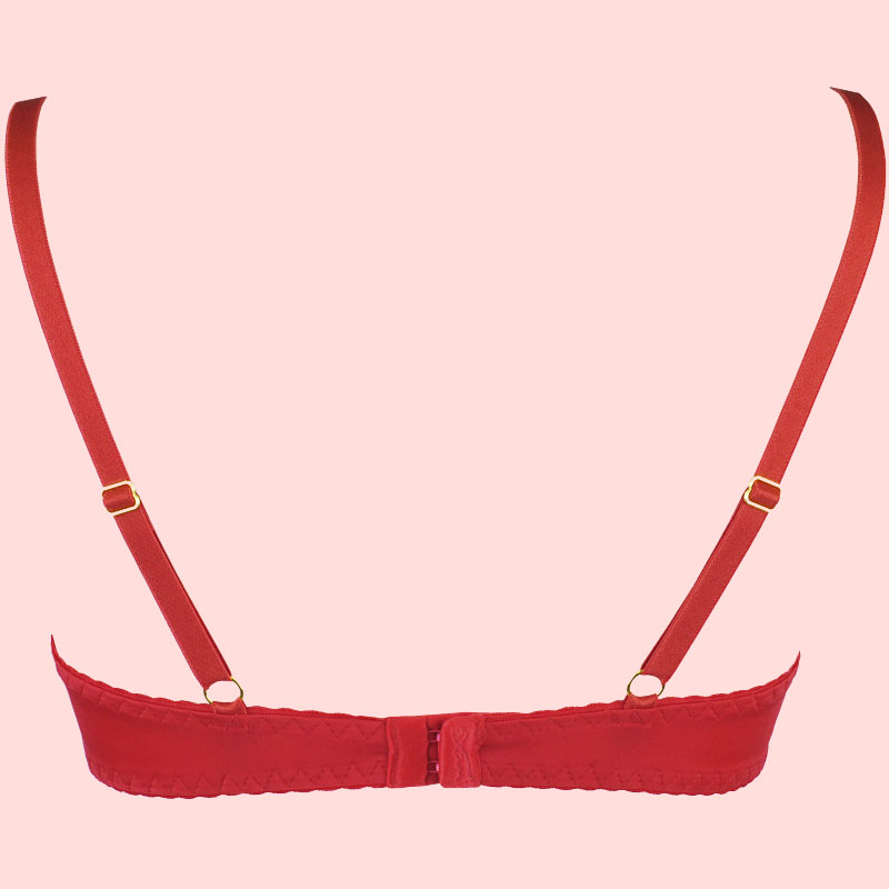 Rinnahoidjal on tugikaared ja ees rinnakorvil kuldsed kaunistused ning punane lillemotiiviga pits. Tagant 3-astmelise kinnitusega ja täielikult õlapaeladest reguleeritav, mis tagab ideaalse sobivuse ja kandmismugavuse.