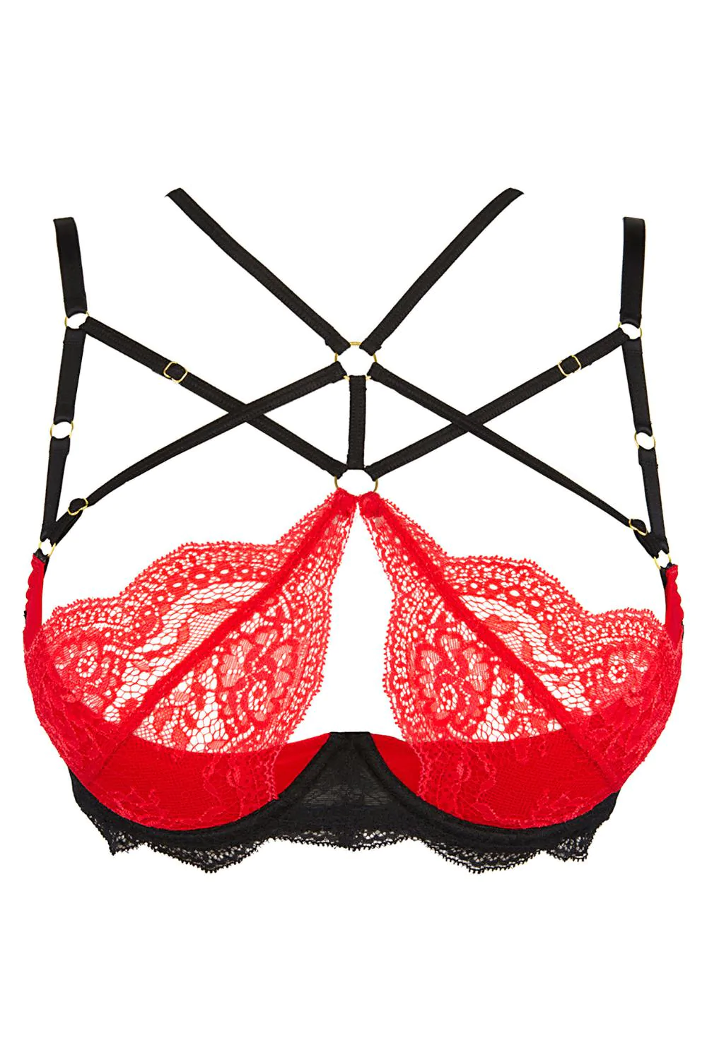Poolläbipaistva punase tülli ja musta pitsiga rinnahoidja. Rinnakorv tugikaartega ja valmistatud punasest tüllist, mille alumine osa osaliselt polsterdatud.