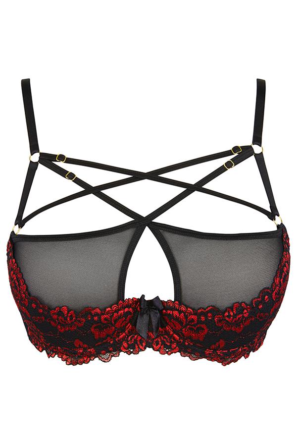 Poolläbipaistev rinnahoidja, mis ääristatud punase ja musta pitsi kombinatsiooniga. Läbipaistev rinnaosa lisab atraktiivsust ja jätab ruumi fantaasia jaoks.