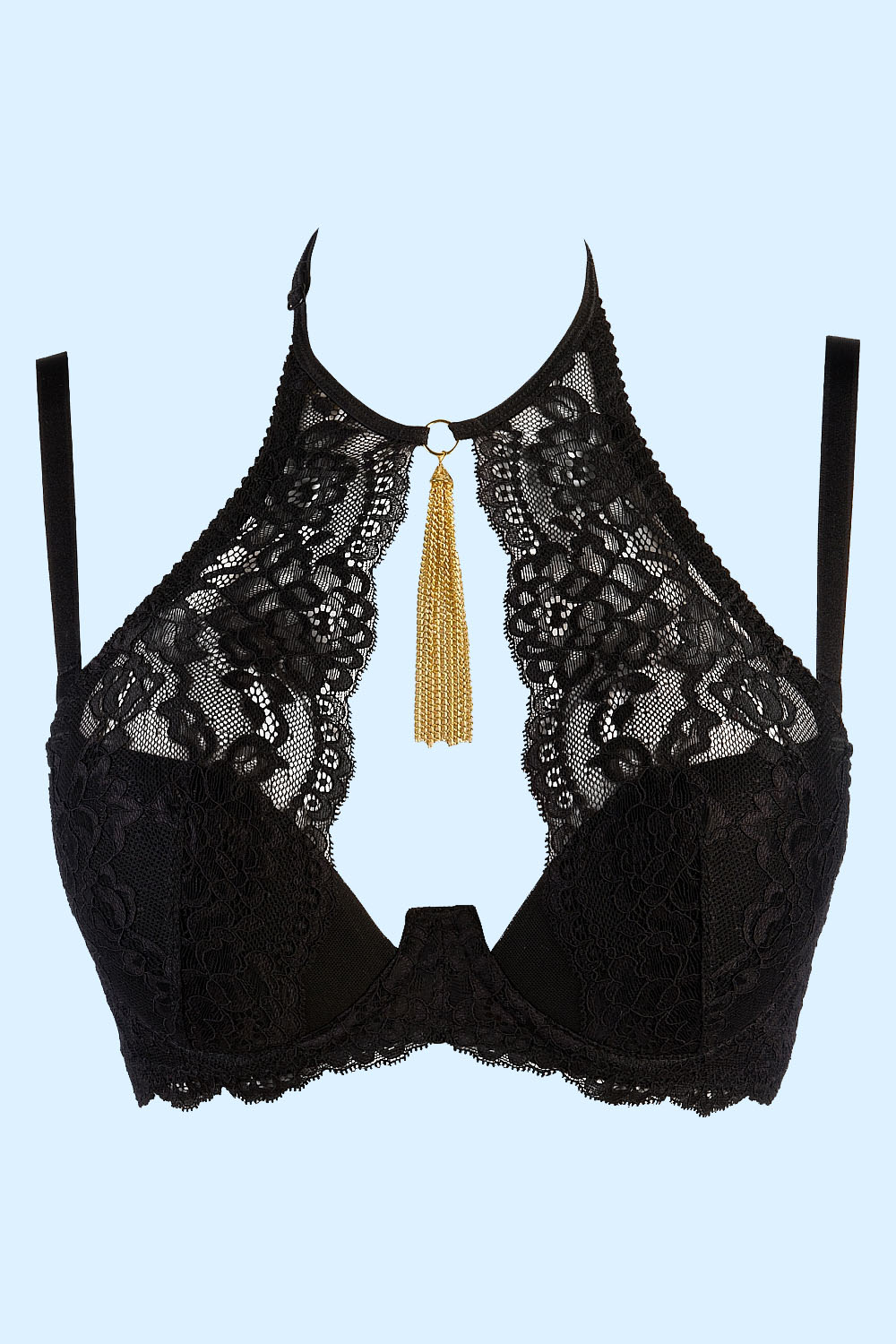 Mustast pitsist rinnahoidja Axami V-9451. Rinnakorv tugikaartega ja polsterdustega. Dekoltee keskosas kaunis hõbedane kett-kaunistus.
