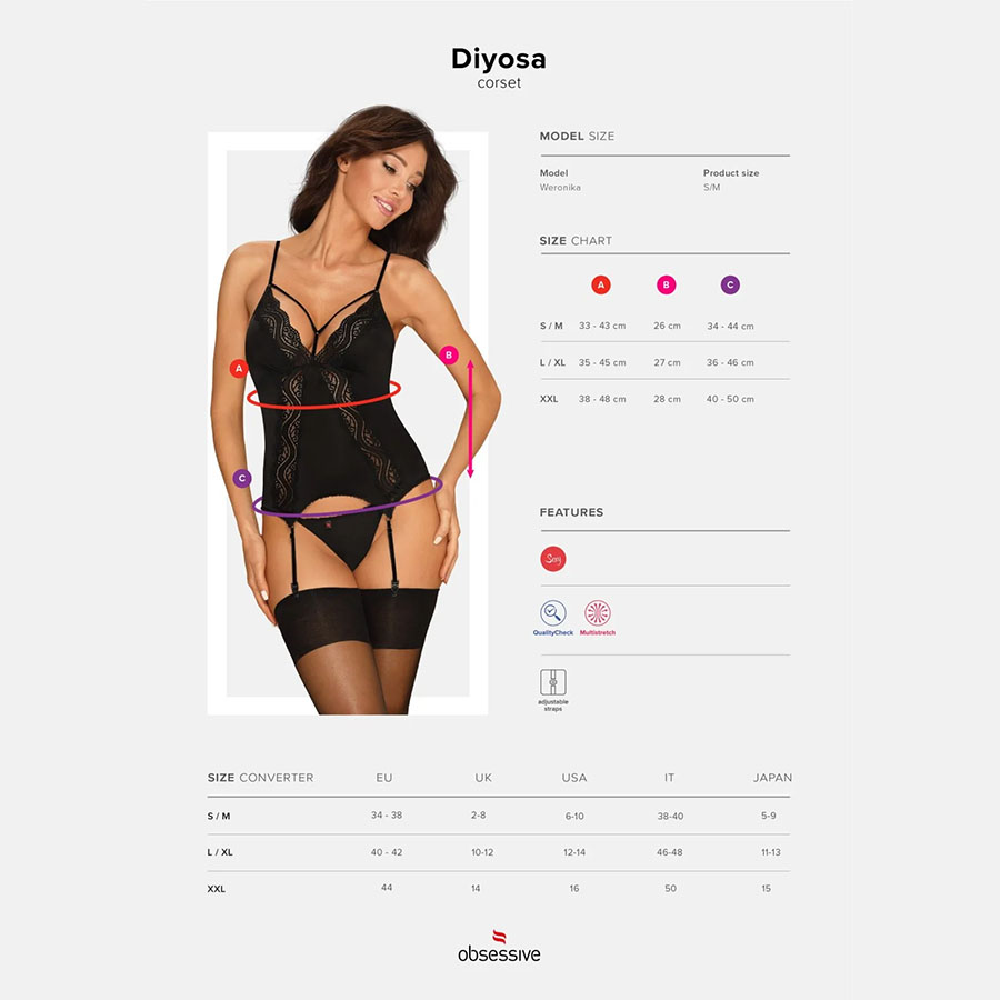 Korsett Obsessive Diyosa on naiseliku lõikega korsett, mida kaunistab ülimalt seksikas must pits. Lisaks on tootel aegumatu disain, mistõttu on erinevaid kasutusviise lõputult.