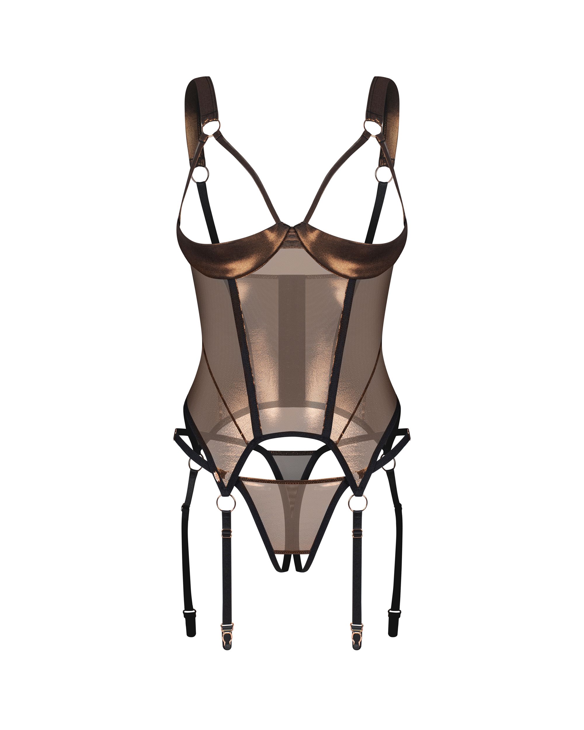 Korsett Obsessive Soranna on sensuaalne kaheosaline pesukomplekt, mis ühendab kuldse sädeluse ja läbipaistva võrkkanga. Trugikaartega korsett tõstab ja rõhutab rinnakorvi, samal ajal kui vertikaalsed õmblused ja korseti lõige optiliselt vormivad figuuri ja rõhutavad vöökohta.