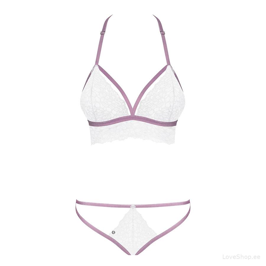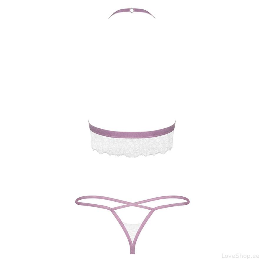 Obsessive Lilyanne on seksikas kaheosaline pesukomplekt, mis on valmistatud valgest pitsist ning kaunistatud helelillade triipudega. Rinnahoidja sobib suurepäraselt väiksema rinnakorviga naistele.