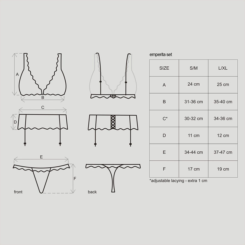 Obsessive Emperita on elegantne ja luksuslik pesukomplekt naistele, kes soovivad end tunda enesekindlalt ja võrgutavalt. Komplekt koosneb rinnahoidjast, sukavööst ja stringidest.
