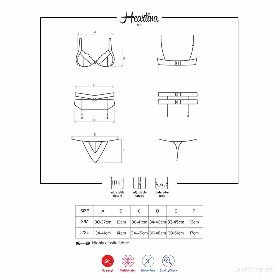 Obsessive Heartina on kütkestav 3-osaline pesukomplekt, mis sobib kandmiseks igapäevaselt või romantilisematel õhtutel. Toode on valmistatud seksikast poolläbipaistvast materjalist, mis on kaunistatud sensuaalse pitsiga.