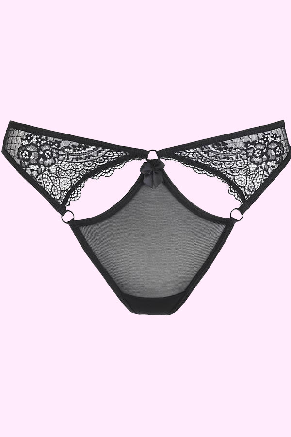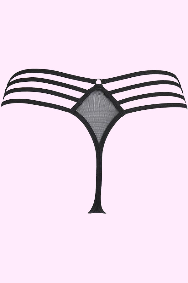Valmistatud poolläbipaistvast mustast pitsist ja tüllist, mida rõhutab elegantne ja elastne kangas, on need stringid tõeline pilgupüüdja. Tagumist osa kaunistavad neli õrna paela, mis loovad tuharaid rõhutava kombinatsiooni, andes lisaks unikaalse ja intrigeeriva ilme.